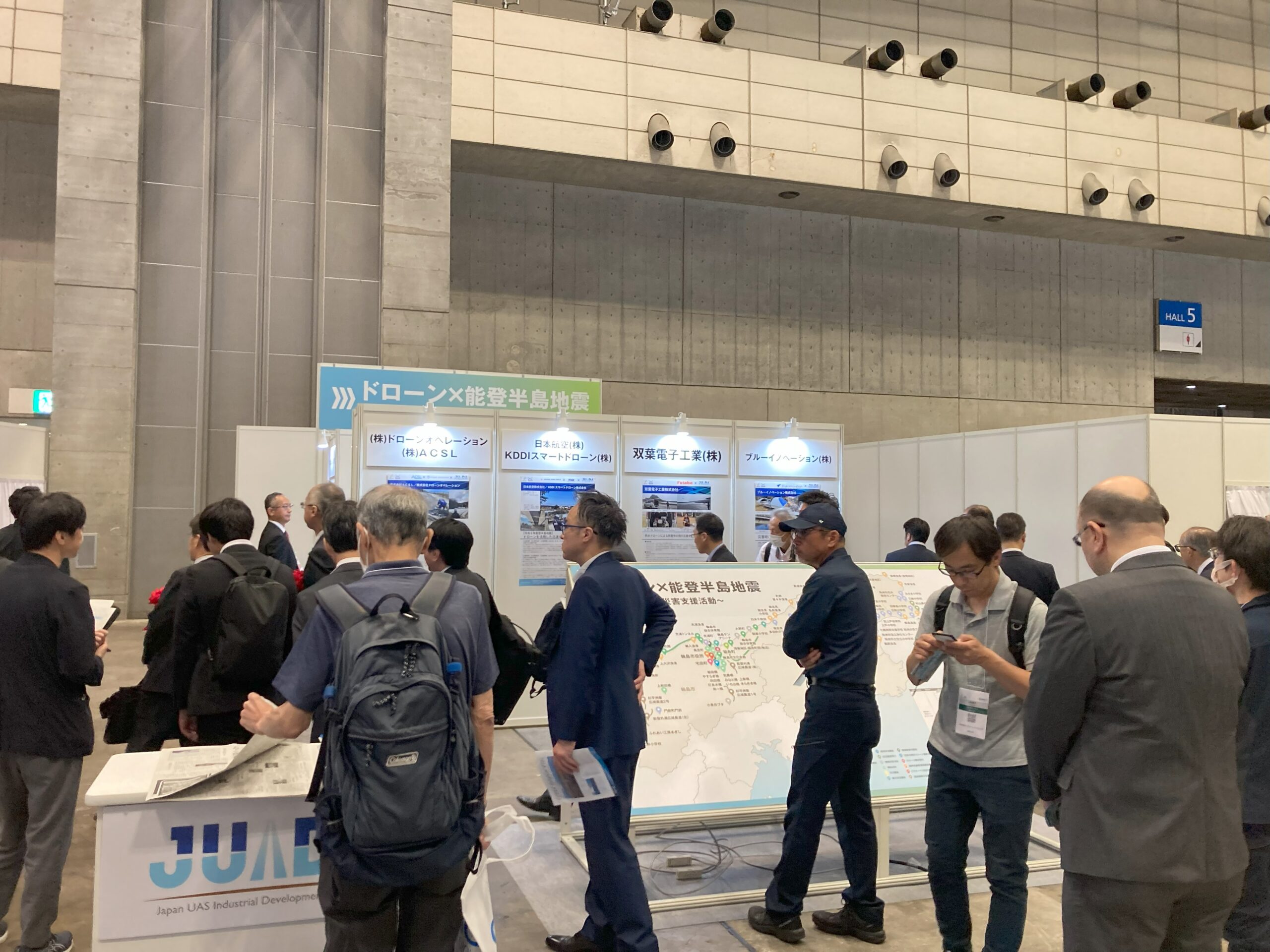 ■JUIDA主催者ゾーン。こちらのブースでは、能登半島地震において、ドローンを用いた災害支援として、JUIDAと共に活動された企業の皆様に、ポスターにてそれぞれの活動や課題を報告していただきました。能登半島の地図には、全てのご協力企業様の活動場所と内容を記載し展示いたしました。