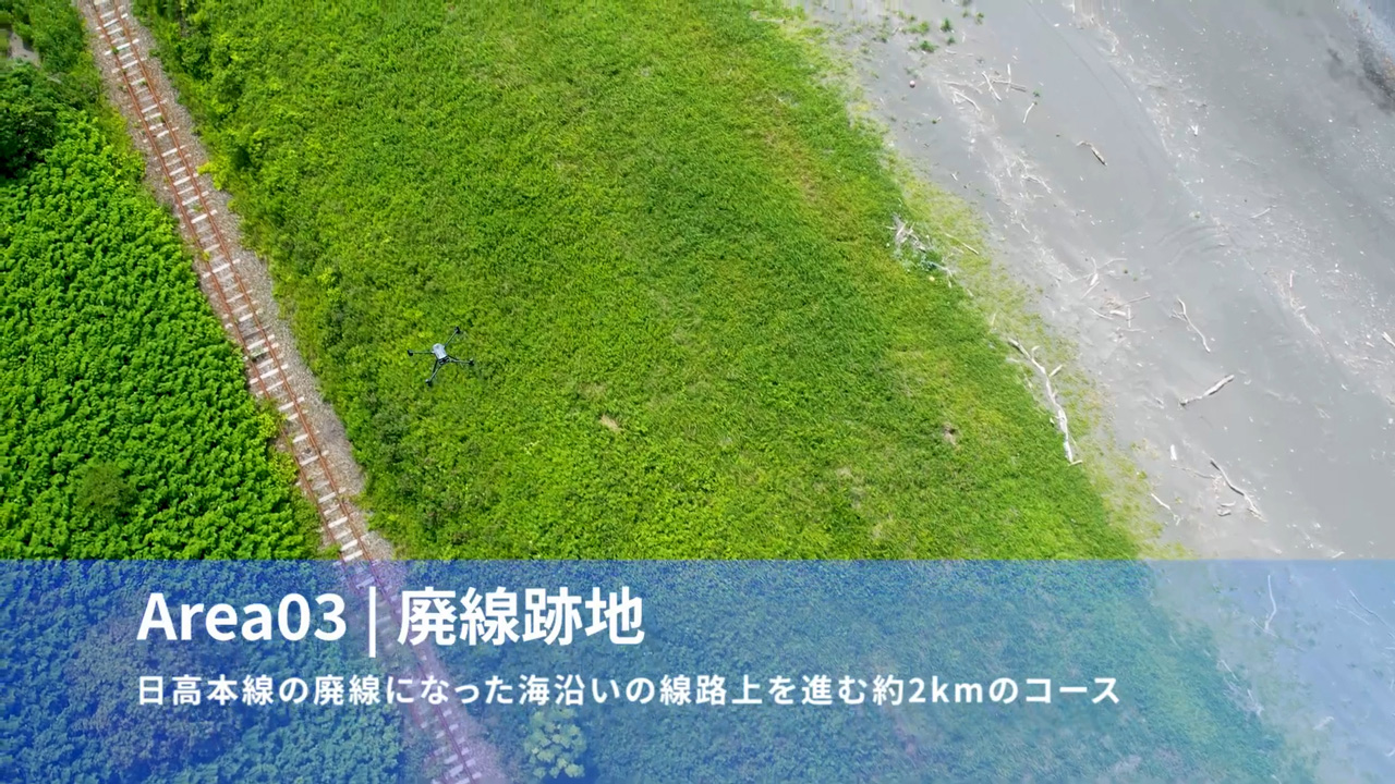 - 日高線跡地では線路上空2kmの直線的な飛行ができます
