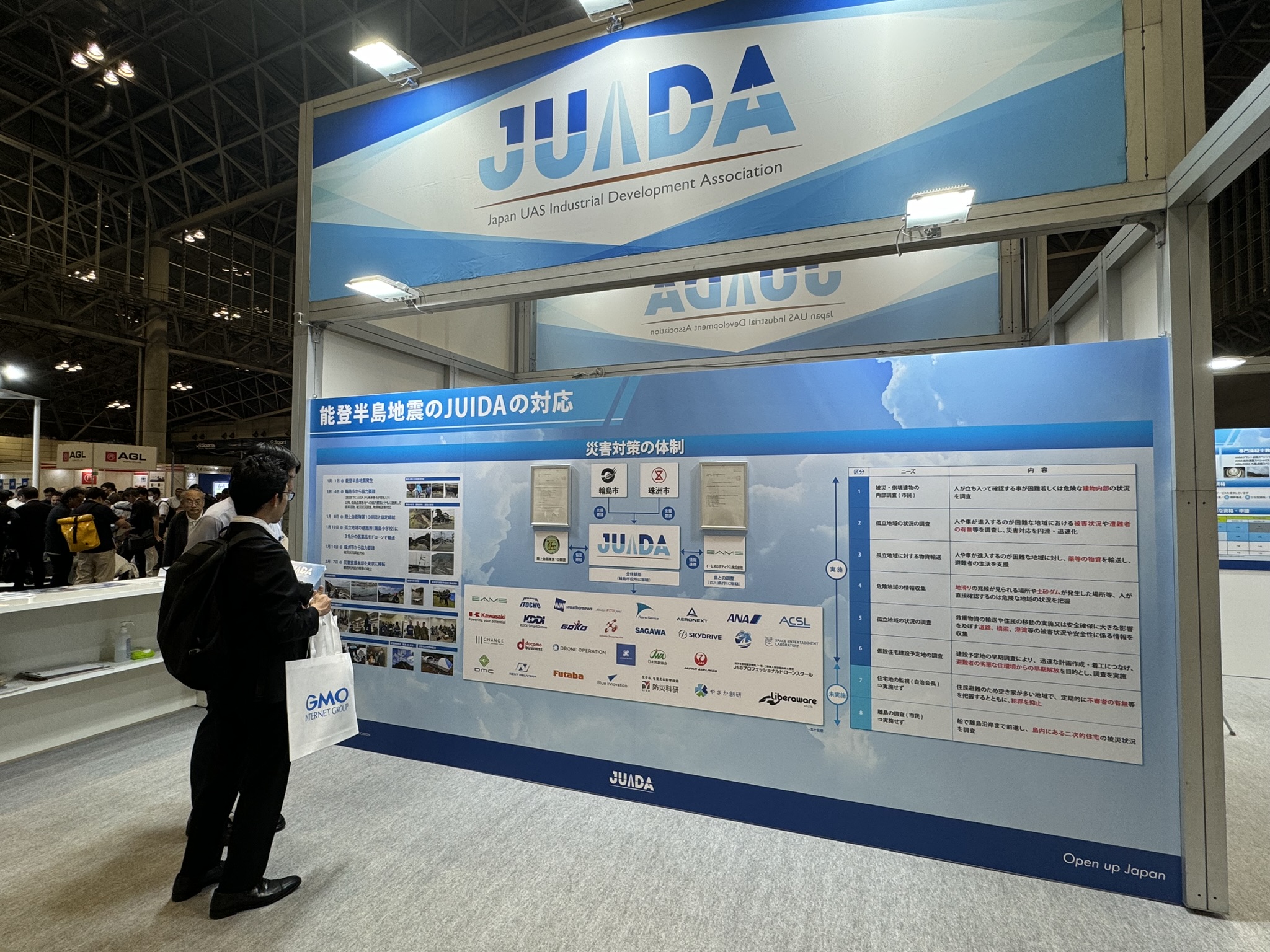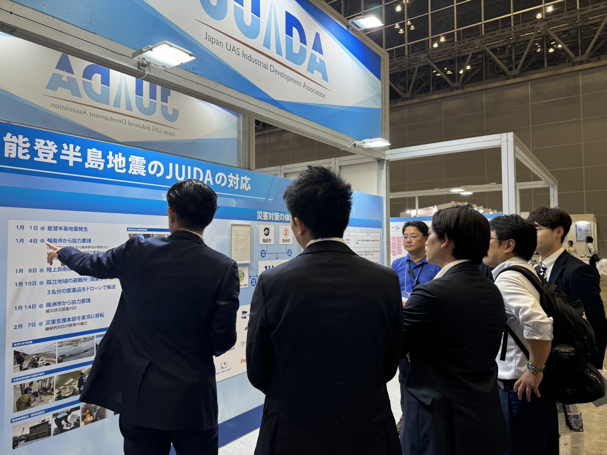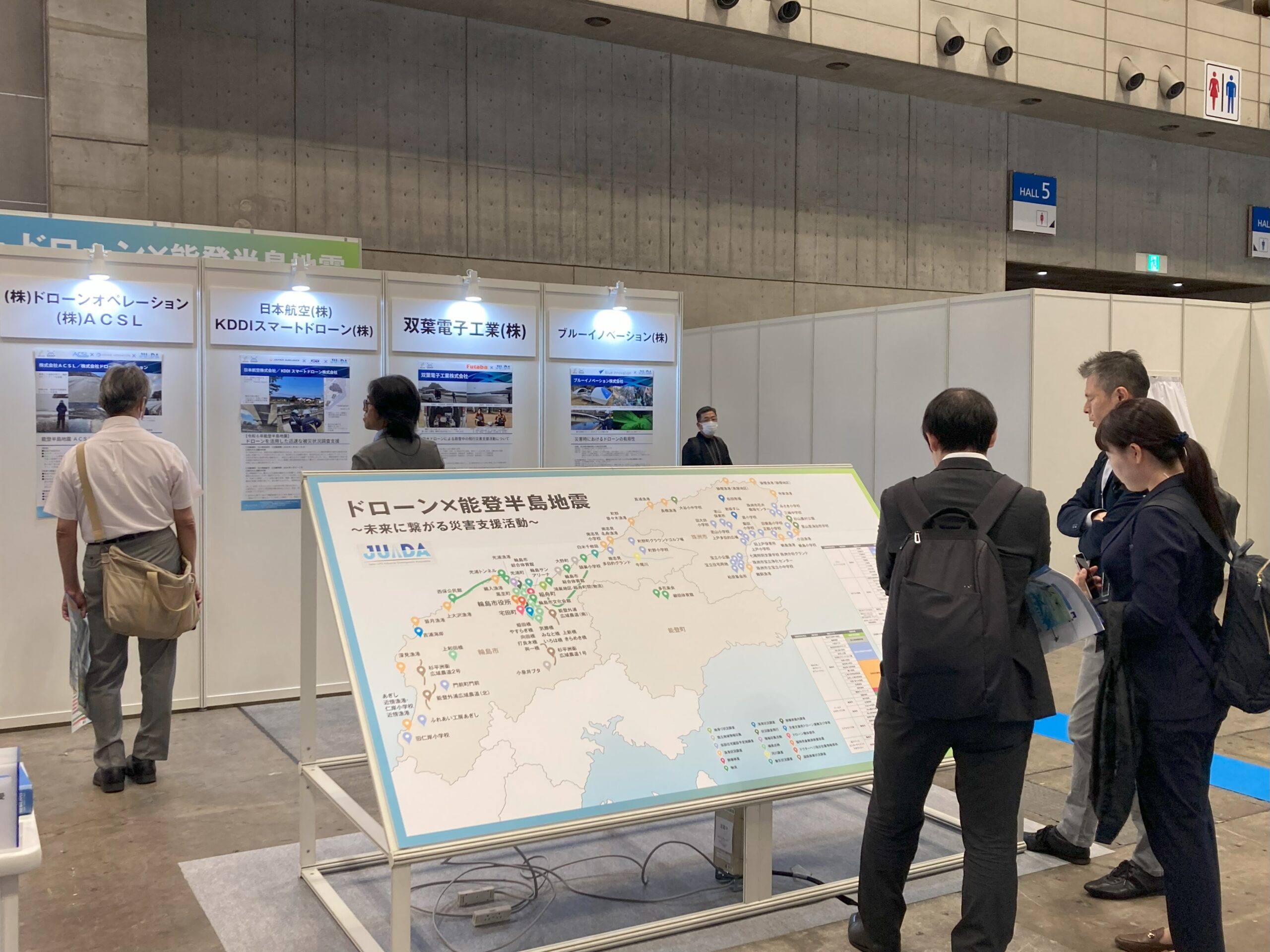 ■JUIDA主催者ゾーン。こちらのブースでは、能登半島地震において、ドローンを用いた災害支援として、JUIDAと共に活動された企業の皆様に、ポスターにてそれぞれの活動や課題を報告していただきました。能登半島の地図には、全てのご協力企業様の活動場所と内容を記載し展示いたしました。