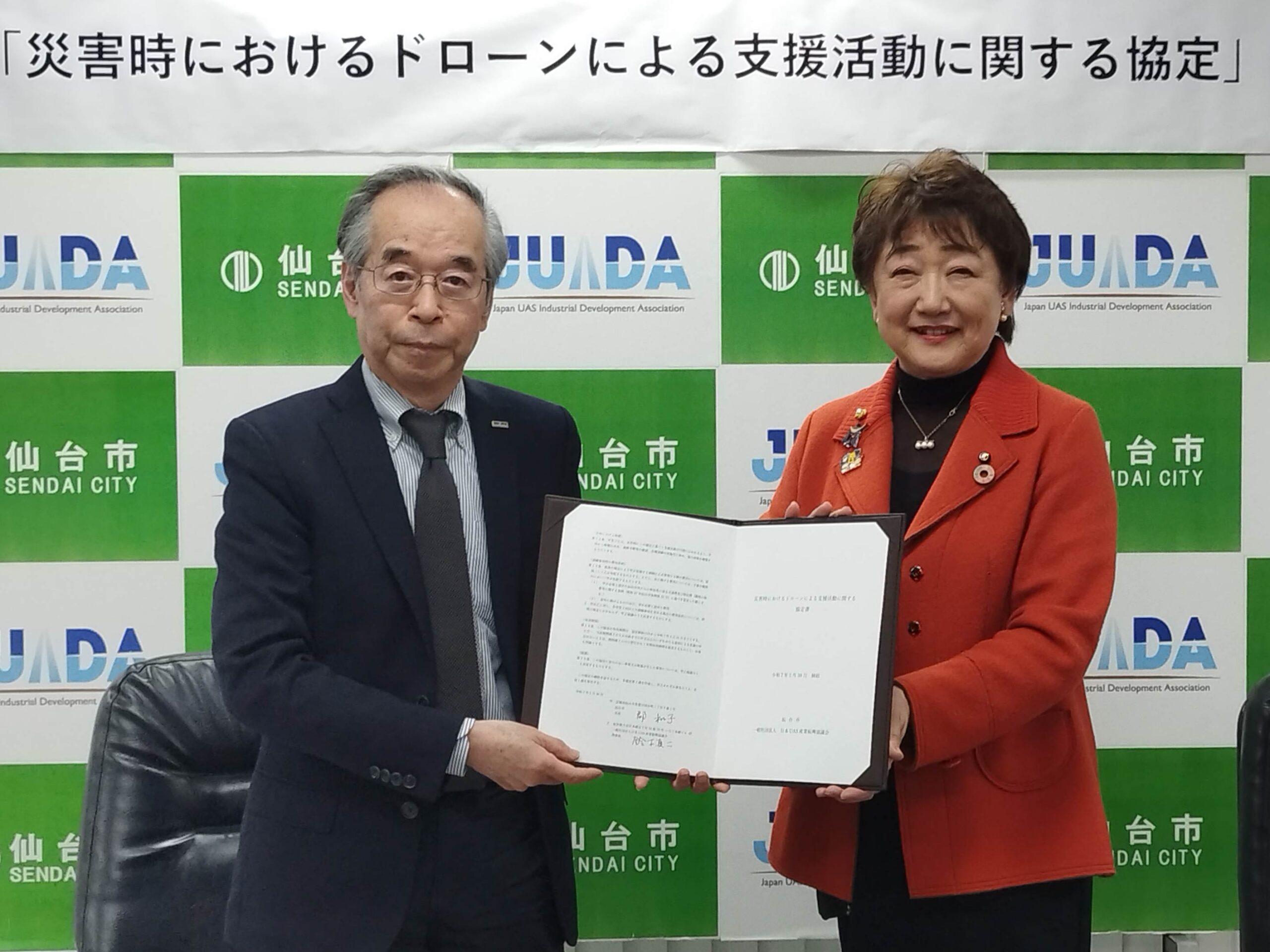 - 仙台市長:郡和子様 (右)とJUIDA理事長:鈴木真二(左)