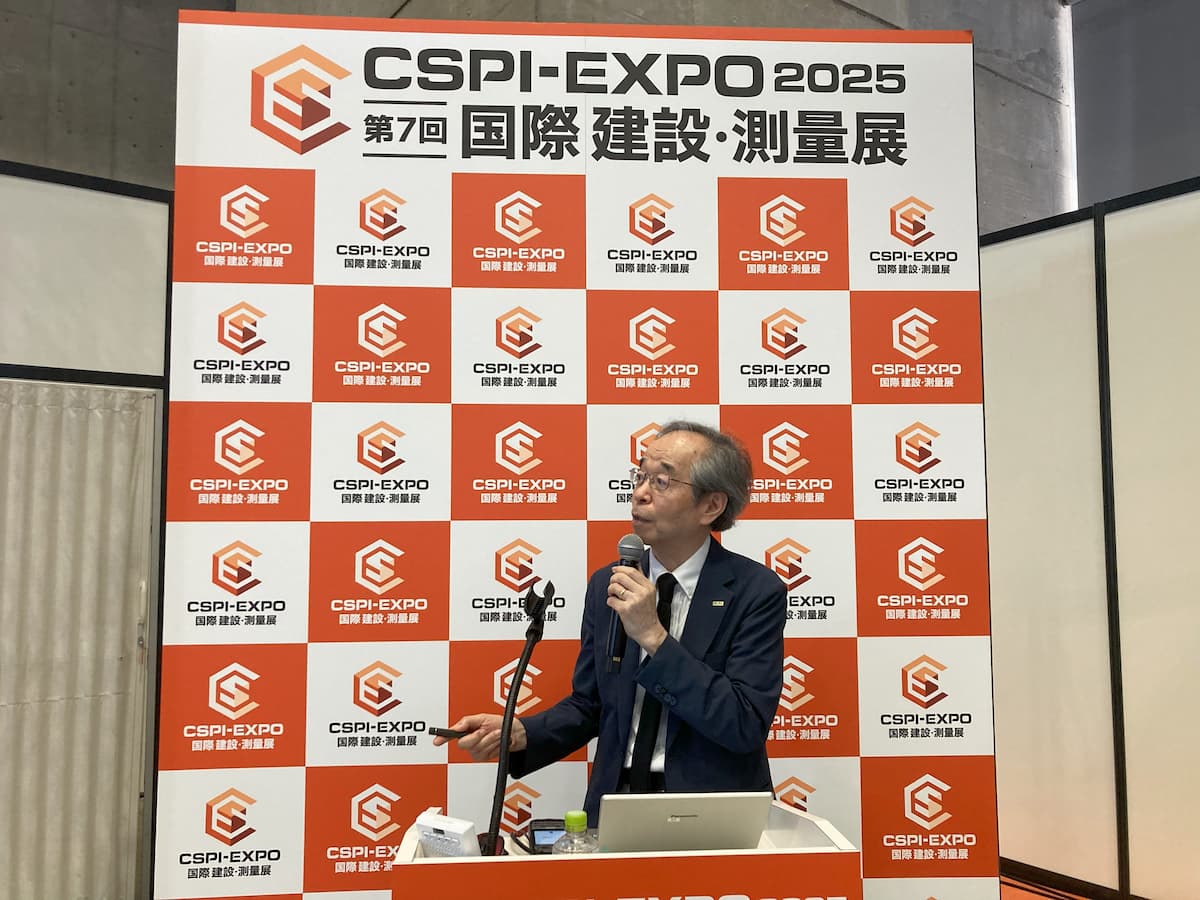 建設・測量業界関係者が集まる、商談・情報収集・課題解決のための展示会、『第7回 国際 建設・測量展(CSPI-EXPO2025)』の初日6月18日(水)、JUIDAの鈴木理事長がオープニングセレモニーのテープカットに参列しました。同日午後は、『建設・測量分野におけるドローンの最前線 最新の適用事例と、飛行安全のため法制度』と題し、複数ドローンの連携飛行でリアルタイム3次元計測を可能とする研究事例や、物資輸送や点検、警備など様々な分野への適用を紹介するとともに、安全な飛行に求められる技術や法制度について、1時間の講演を実施いたしました。