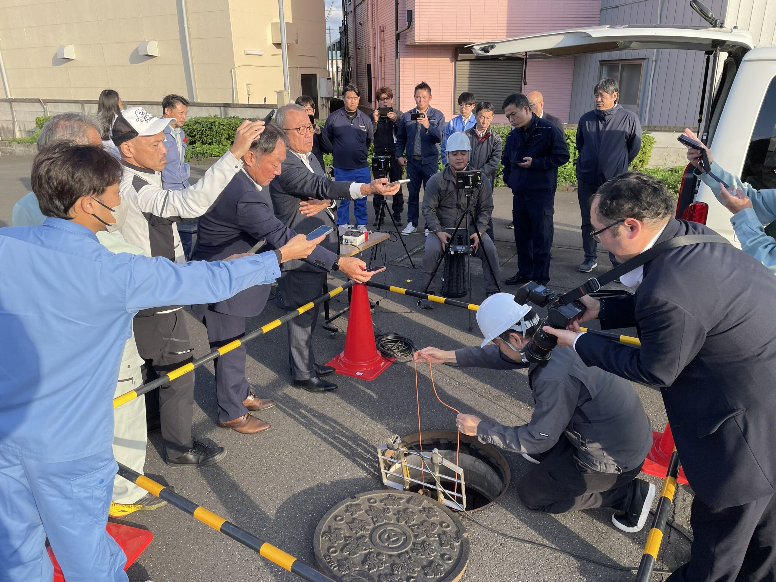 - ドローンを管路内におろす様子をカメラに収める参加者