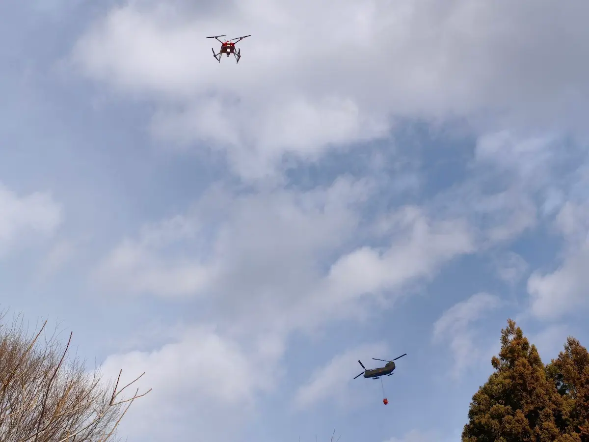 なお、Prodrone社の飛行は、自衛隊や消防がヘリによる消火活動を行なっている昼間に行っていたことから、航空の安全を確保するため関係機関が的確に航空運用調整を行うとともに、Prodrone社のパイロットや補助者には、ヘリが上空を飛び交う中で調整に基づく正確かつ細心の飛行を行なっていただきました。林野火災において、へりとドローンが同時に同一場所を飛行したのは国内では初の事例となります。(JUIDA調べ)