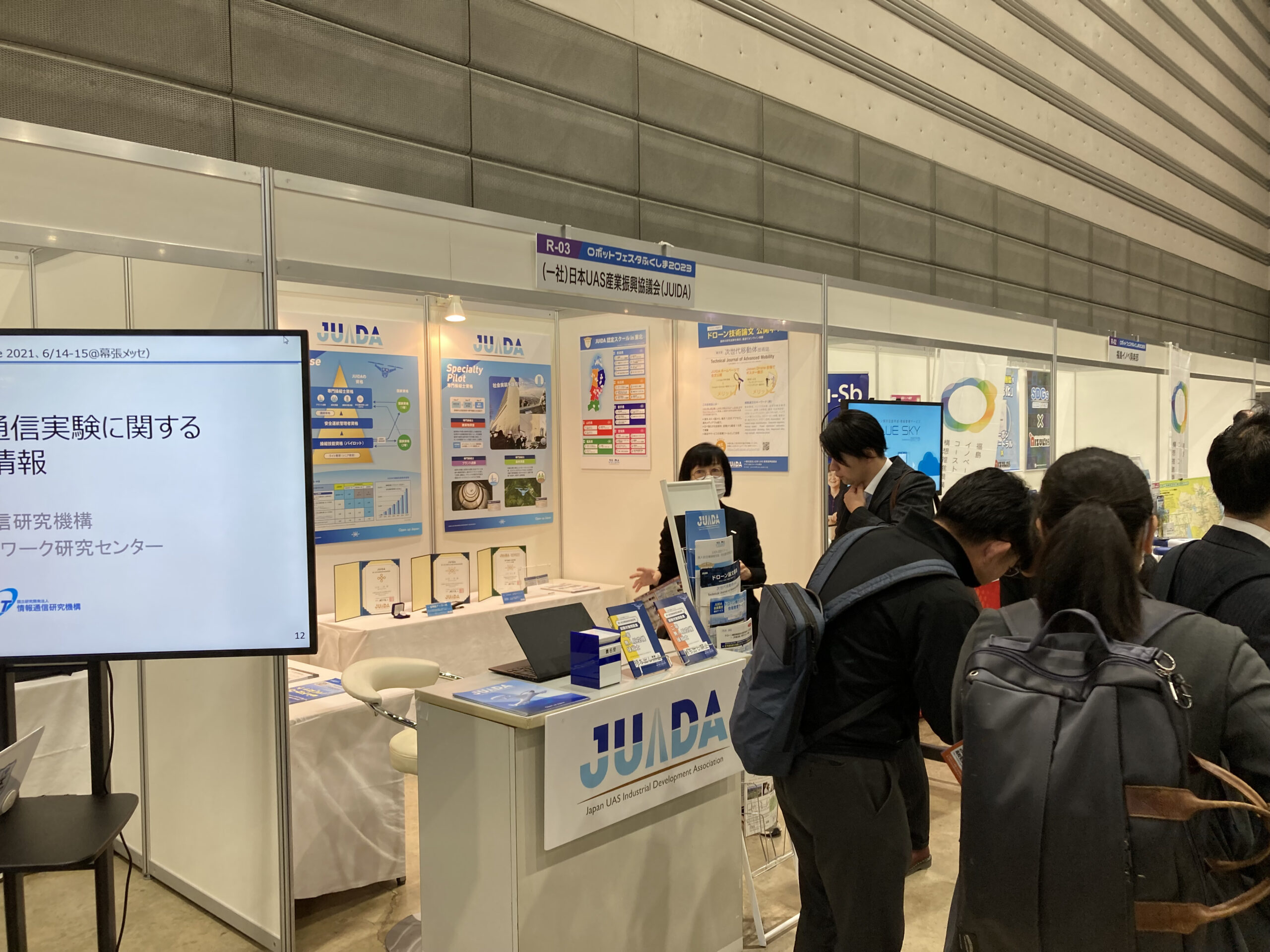 2023年11月22日(水)~11月23日(木・祝)の2日間、福島県主催、JUIDA後援・出展『ロボット・航空宇宙フェスタふくしま 2023』が、福島県郡山市のビッグパレットふくしまにて開催されました。JUIDAのブースではJUIDA認定スクールに関する説明や、その他JUIDAの取組みについてご紹介いたしました。 2日間にわたり、福島県および東北地方をはじめ遠方からも、JUIDA会員の方、JUIDA認定スクールにご興味をお持ちの方々がブースへ多数お越しくださいました。ご来場いただきました皆様へ、心より御礼申し上げます。
