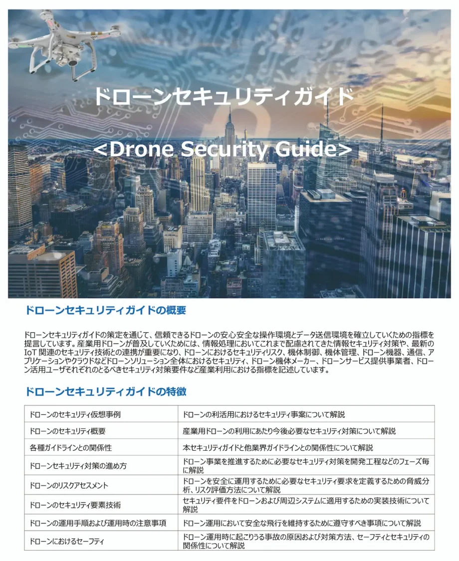 本ガイドでは、ドローン運用におけるセキュリティリスクの解説をはじめ、機体制御や管理、デバイス本体、通信、さらにはアプリやクラウドまで、ソリューション全体を網羅したセキュリティ要件を定義しています。あわせて、安全な運用に欠かせない「セーフティ(安全性)」に関する要件についても詳しく解説しています。